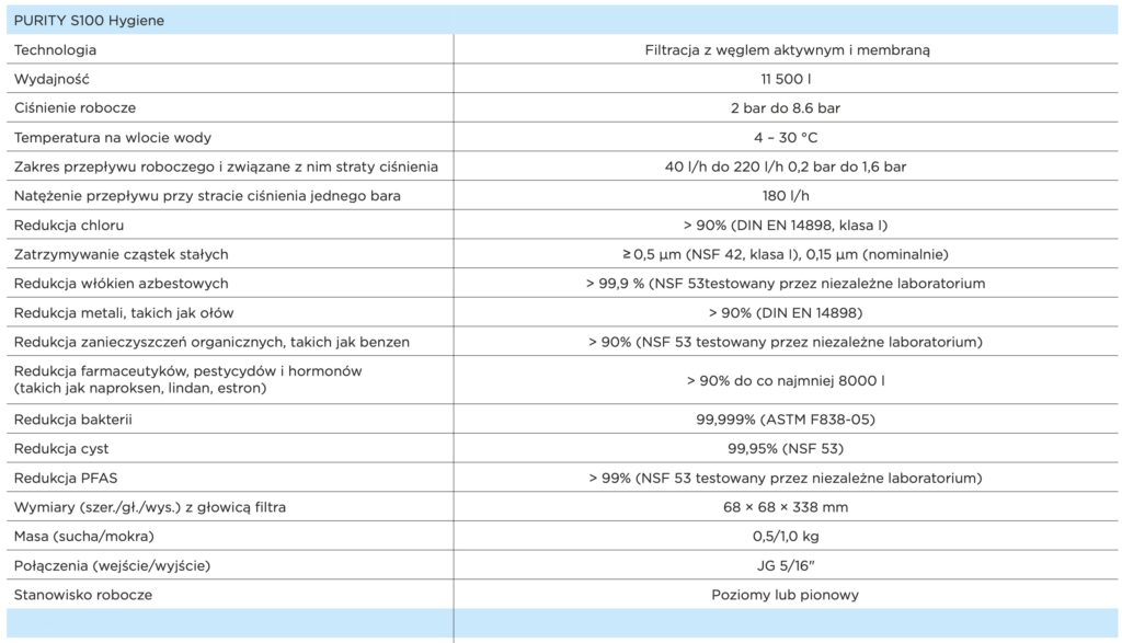 Filtr PURITY S100 Hygiene został zaprojektowany do dyspenserów wody, specjalnie dla miejsc wrażliwych na higienę. Dla sektora publicznego, opieki zdrowotnej i branży HoReCa, gdzie przepisy wymagają ochrony bakteryjnej. Możesz mieć pewność, że PURITY S100 Hygiene zapewnia niezawodną ochronę przed bakteriami i cystami oraz stałe zatrzymywanie cząstek > 0,15 μm, dzięki membranie mikrofiltracyjnej.